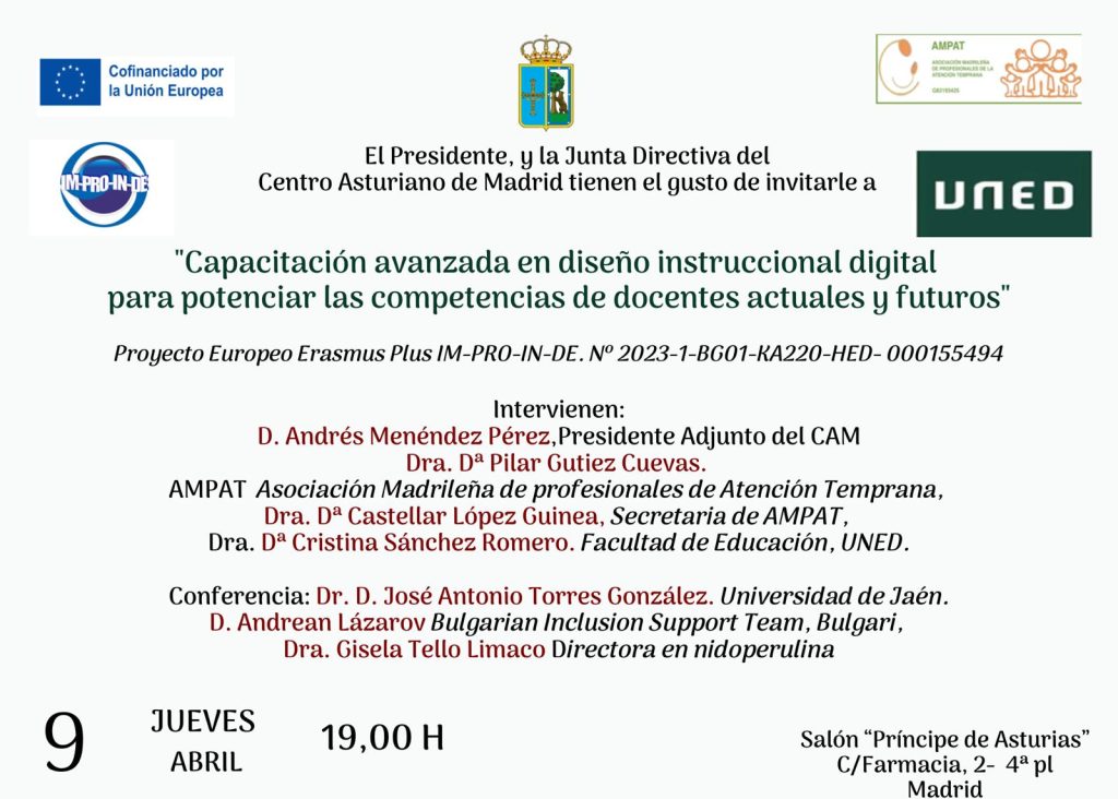 The video class titled “IM-PRO-IN-DE: ‘Improvement of digitalisation competences of recent and future teachers by development of advanced training on instructional design of digital training'” is now available on UNED Channel. Here you may find all information related to the pilot implementation phase and presentation of the project results by Prof. PhD Cristina Sanchez Romero (UNED), Prof. PhD Pilar Gutiez Cuevas (AMPAT) and Mr. Andrean Lazarov (BIST). It was promoted via UNED TV Channel with more than 200 000 students and teachers all over Spain and Latin America.